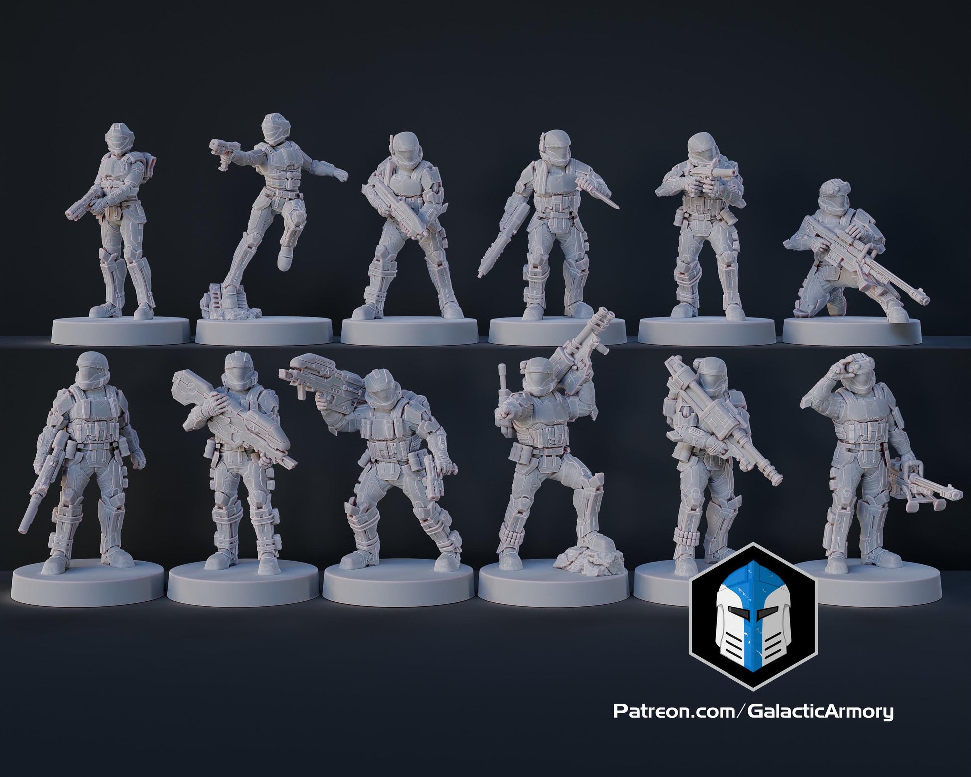 Want to kick start your UNSC army? This pack includes 1 of each of the mini's in my Marine and ODST list! That's 22 mini's in total! This will help start your UNSC forces and give you a good base to start. All mini's will come unfinished and will require the customer to sand, prime and paint themselves. Files for the miniatures come from Galactic Armory and are sold under commercial license.